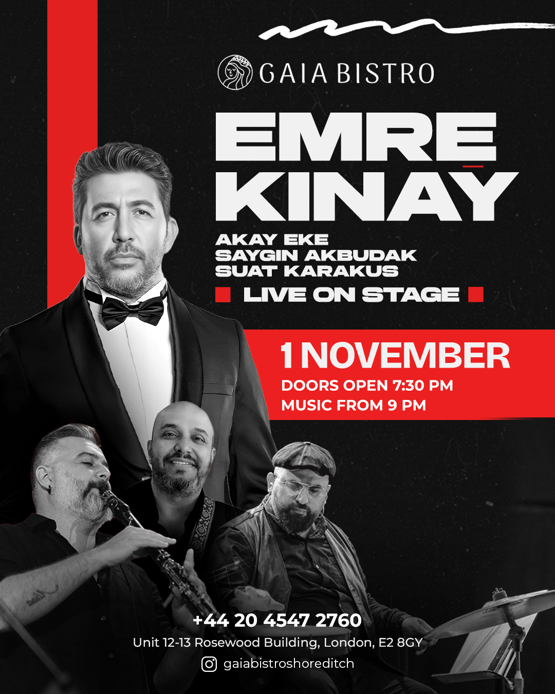 Don’t miss this EPIC Turkish live performance with Emre Kinay, Akay Eke, Saygin Akbudak, Suat Karakus live on stage! Saturday, November 1st, 9 pm (Doors: 7:30 pm) Special Set Menu £60 Per Person Set Menu: Hummus Kopeoglu Mancasi Girit Ezme Olives Beetroot Carpaccio Icli Kofte (potato) Borek Tıckets